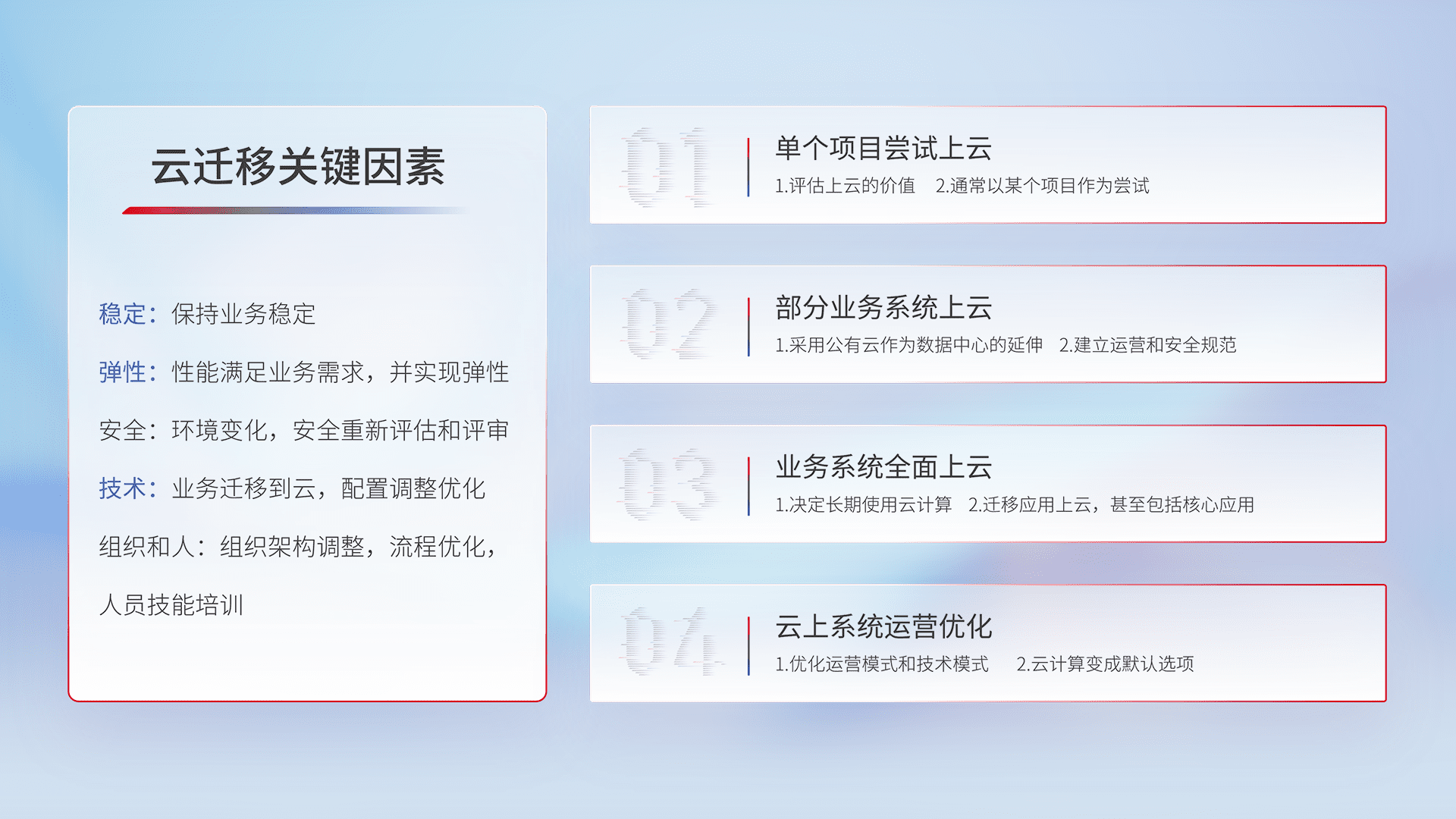 结合实际业务,,,,从规划设计、、云平台选型、、、云原生改造、、、、数据迁移、、集成交付,,,迁移全过程为客户识别最佳上云路径,,,,做好风险识别管理,,,,设计网络架构、、、、身份权限、、、、安全审计合规、、、、操作审计、、、日志审计、、、、监控告警策略、、、多站点容灾设计等,,,对云上基础设施进行整体规划,,,提升IT治理水平,,,,以满足弹性、、、高可用、、高性能的需求。。。。
