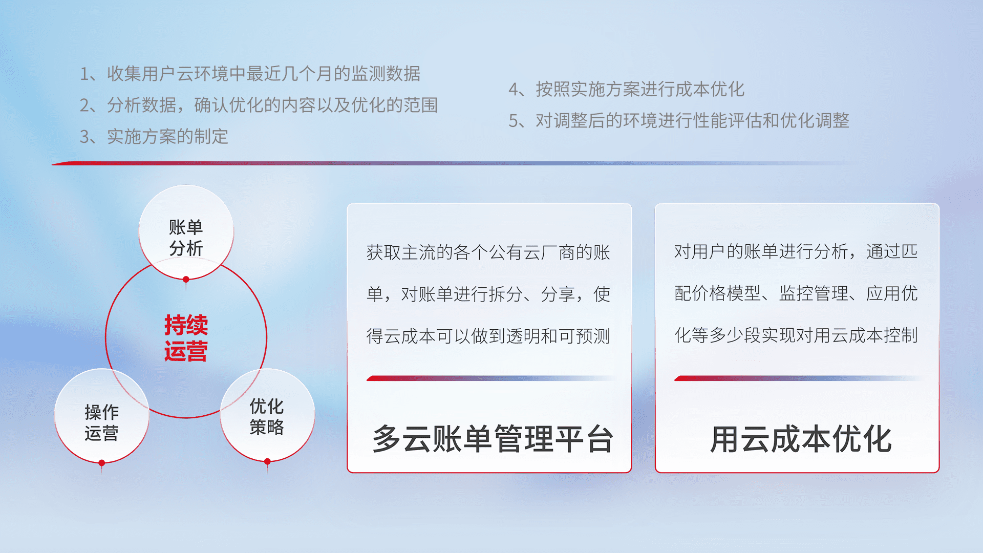 通过多云纳管,,,,以统一的资源数据模型把客户的云资源进行抽象和封装,,,,进而实现对多云资源的统一操作,,,保障云资源管理的可靠性、、稳定性与可用性。。。。量身定制化运维内容,,,,配置、、、、开发运维、、补丁管理、、、、备份、、、、监控、、认证和访问管理、、、、审计和日常巡检等,,保障在用云过程中的可靠度,,,,稳定度以及高可用率。。。